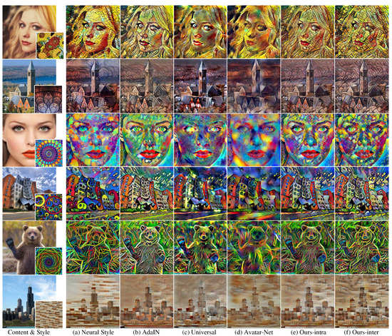 - Li, Y.; Fang, C.; Yang, J.; Wang, Z.; Lu, X.; Yang, M.H. Universal style transfer via feature transforms. In Proceedings of the Advances in Neural Information Processing Systems (NeurIPS), Long Beach, CA, USA, 4–9 December 2017; pp. 385–395. [Google Scholar]
