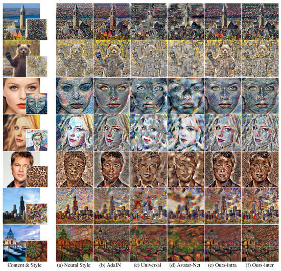 The result images of existing style transfer methods and Ours-intra/inter based on the VGG 19 feature network: The target content images and style images were not used during network learning.