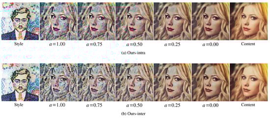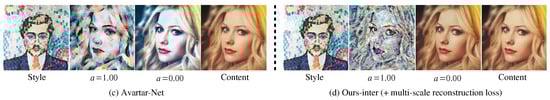We compared the style-content interpolation results of Avatar-Net [] and our methods (Ours-intra/inter). The result images were generated by varying the style-content trade-off factor a [] of all multi-scaled transformers (for our methods) or a decorator (for Avatar-Net) in VGG 19 network architecture. Figure 6 shows the result images. When for content reconstruction, the images of our methods (Figure 6a,b)) were very similar to the content image but with a slightly darker tone, while the images of Avatar-Net (Figure 6c) had the color tone of the style image, which was different from that of the content image.