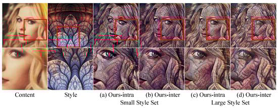 Feed-forward networks have their capacity of style representation, and we tested the style capacities of our Intra/Inter-scale methods by observing their result images from two decoder networks trained using a small style set and a large style set in Section 4.1. Figure 7 shows the result images. For both small and large numbers of styles, Ours-inter (Figure 7b,d) transferred the coarse to fine wrinkle patterns of the style image compared with Ours-intra (Figure 7a,c). This observation shows that the co-occurring multi-scaled patterns of the style image can be better transferred by using the inter-scale feature statistics.