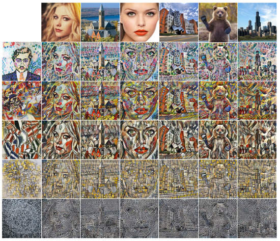 - Gatys, L.A.; Ecker, A.S.; Bethge, M.; Hertzmann, A.; Shechtman, E. Controlling Perceptual Factors in Neural Style Transfer. In Proceedings of the IEEE Conference on Computer Vision and Pattern Recognition (CVPR), Honolulu, HI, USA, 21–26 July 2017. [Google Scholar]