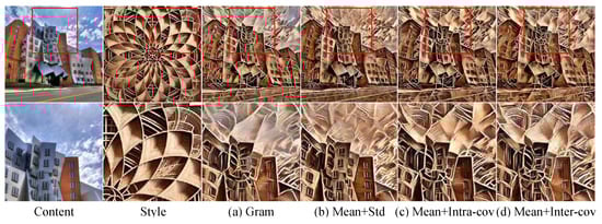 To prove the effectiveness of our intra/inter-scale style losses independent of network architecture, we tested them with the direct pixel-wise optimization method []. Both Figure 10a,c show the results of style losses (Gram and Mean+Intra-cov) considering the channel correlation inside each scale and Figure 10b shows those of Mean+Std loss that do not consider channel correlation.