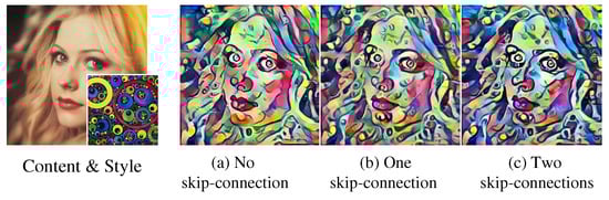 We need to utilize both a decoded feature map from the previous decoder layer and an intra or inter-scale transformed feature map from the transformer of Section 3.1 in each layer of the decoder network to generate the output stylized image considering intra or inter-scale correlations for all scales. For this purpose, we adopt skip-connections, which have been applied to several applications in the computer vision field [,,] to merge two different feature maps in a decoding process. Skip-connected two-scale features are optimally merged by a trainable convolution layer, and this improves the quality of a decoded image by considering multi-scaled filter responses.