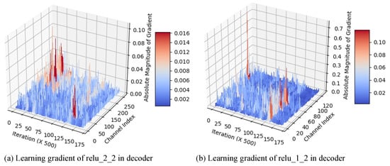 Figure 12 shows the absolute values of total loss gradient regarding to decoded feature map from decoder (channel index for Figure 12a or for Figure 12b) and skip-connected feature map from transformer (channel index for Figure 12a or for Figure 12b) in our network (Figure 2). Each value of the graph was sampled every 500 iterations. For the first skip-connection (Figure 12a), the absolute gradient corresponding to the skip-connected feature map is larger than that of the decoded one at the beginning of training process. This indicates that the feature map of the pre-trained encoder matters in reducing the total loss.