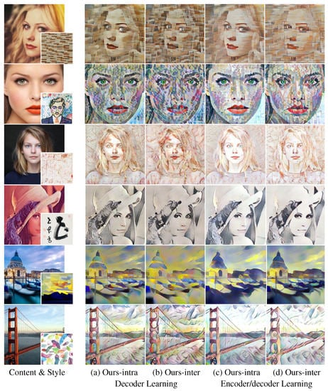 In the aspect of processing speed, the average (standard deviation) of the elapsed times for 500 test images of 256 × 256 pixels are presented in the second to fifth rows of Table 3. The feed-forward methods (Table 3 (b∼f)) were much faster compared with the Neural Style methods (Table 3 (a)) due to the heavy optimization process. The single-network-based methods (Table 3 (b,d∼f)) had a faster decoder speed compared with the cascade-network-based method (Table 3 (c)). In particular, the methods utilizing WCT [], which requires singular value decomposition (SVD) of high computational cost, showed a large drop in speed (Table 3 (c∼f)) compared with AdaIN [] using a light-weight feature transformer (Table 3 (b)).