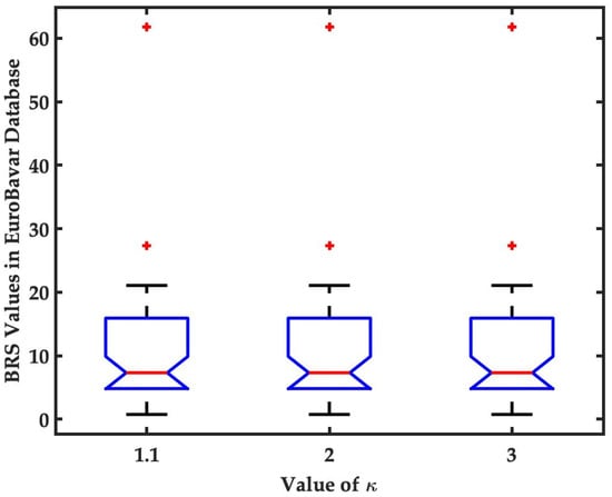 BRS analysis with different values of (1.1, 2 and 3). It can be observed that the BRS value is identical for each value of . In this study, is constantly set to 2. The data points beyond the whiskers are marked by red + symbol.
