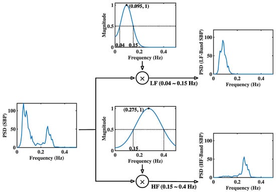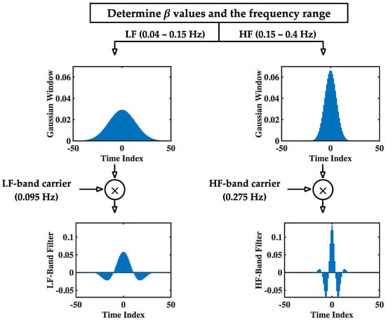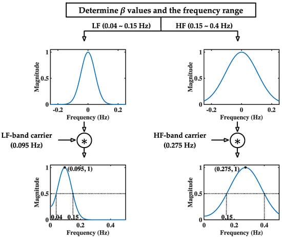 Another issue of concern for the modGauss filter is the determination of passband frequency range. In the spectral methods for human BRS estimation, the commonly adopted low-frequency (LF) band is within 0.04–0.15 Hz and the high-frequency (HF) band is located in the range 0.15–0.4 Hz [32]. In this condition, the center of the dedicated frequency range is selected to be the carrier frequency , which is 0.095 Hz for the LF band and 0.275 Hz for the HF band, respectively. The deviated frequency from the center was previously denoted as . It is assumed that the dB cutoff frequencies are located at the endpoints of both bands in modGauss filters. In this case, the value of is equal to the deviation from to the end frequency. Therefore, it is 0.055 Hz for the LF band and 0.125 Hz for the HF band. With selection of the and values referred to, the proposed method is constructed from two modGauss filters, one for the LF band and the other for the HF band. The filtering operation is based on Equation (8), which is conducted fully in the time domain but can derive the frequency-domain information in the same way as for other spectral methods.