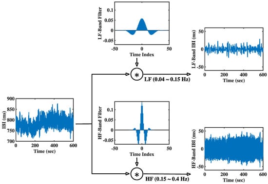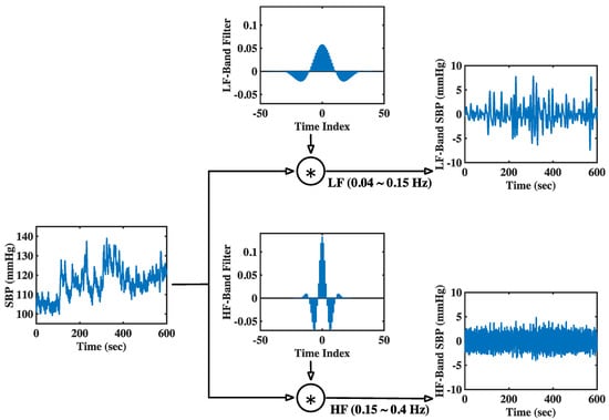 Step 2: Conduct the lowpass filtering on to divide the sequences to components above 0.15 Hz and below 0.15 Hz. Let the components below 0.15 Hz be referred to as . The components above 0.15 Hz represent the HF components for the estimation of BRS and are designated as . Let the HF components for IBI and SBP sequences be denoted by and . The HF band energies can therefore be calculated by squared summation, as shown in Equations (11) and (12).