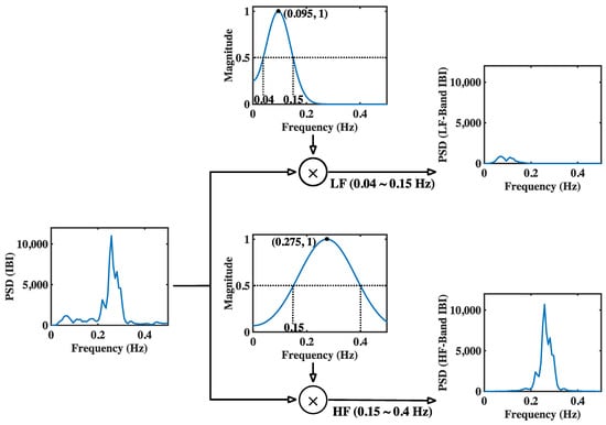 In this figure, the generation of both modGauss filters is based on Equations (1), (3)–(6) with , Hz, Hz (for the LF band) and 0.275 Hz (for the HF band), and Hz (for the LF band) and 0.125 Hz (for the HF band). The corresponding modGauss filters from the frequency-domain perspective are shown in Figure 3, where the parameters are the same as those for Figure 2. It can be observed that the generated modGauss filters are bell-shaped bandpass filters centered at 0.095 and 0.275 Hz with the dB cutoff frequencies corresponding to the frequency ranges of the LF and HF bands, respectively.