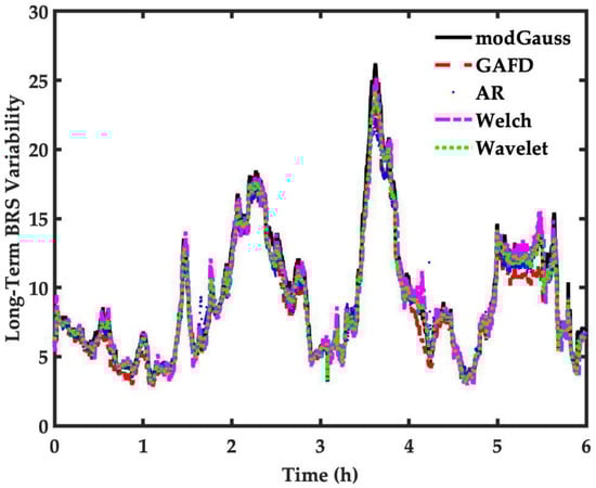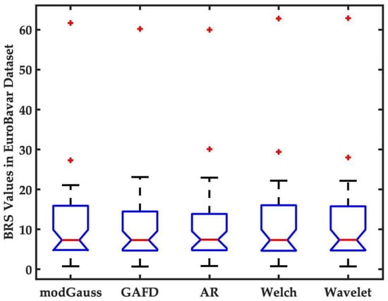 To evaluate the performance and effectiveness of our proposed method, four other approaches—GAFD, AR spectrum, Welch’s periodogram and wavelet—were chosen for performance comparison. The present study used the EuroBavar dataset to confirm the applicability of the newly suggested approach. Although this dataset has been used in other studies [33,44,45], it is important to note that few studies have shown all the derived BRS values for each data record in the dataset. Figure 8 represents the BRS value for each of the methods discussed in this study. It can be observed that the median BRS value was almost identical for each of the five methods, which indicates that the proposed modGauss algorithm is comparable to the other methodologies for BRS estimation.