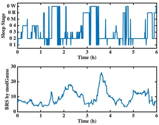 When selecting a computational algorithm for BRS estimation, a key consideration is the ability of the algorithm to perform long-term analysis. In this regard, a comparative analysis was performed for long-term BRS estimation between the proposed modGauss and sleep stage, with the results shown in Figure 9. The signal slp45 from the MIT-BIH Polysomnographic Database [53] of PhysioNet [54] was adopted for the long-term BRS analysis. In this figure, the proposed modGauss algorithm was used to perform an analysis of the BRS estimate for a duration of 6 h. From Figure 9, it can be seen that the BRS values generally increased after the awake stages, which implies arousal of the baroreflex function when a person is awoken from the sleep stage. With respect to sleep, the increase in BRS values and the delay in BRS elevation after waking up are topics which may warrant further study.