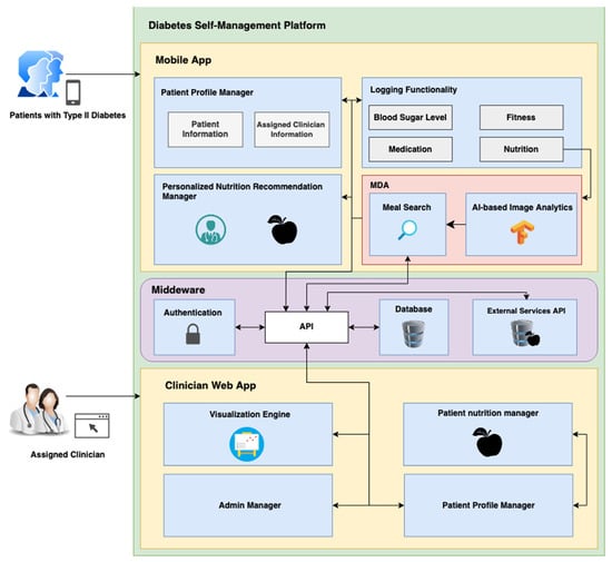 To address the identified key voids in the diabetes self-management solutions, this paper proposes, develops, and implements a nudge-theory-inspired personalized diabetes self-management platform for patients with type II diabetes. In this paper, we present the implementation of this platform, which has been co-designed with clinicians and patients with type II diabetes, ensuring that the features of the platform provide for personalized self-management and the platform is fit for purpose. The co-design process identified that a holistic diabetes self-management platform is required to ensure that we address the gaps found in the current literature, as well as the plethora of diabetes self-management solutions currently available. Since type II diabetes directly correlates with poor lifestyle and nutrition management [], to develop a holistic solution, the proposed self-management solution needs to contain ways to manage a patient’s nutrition, fitness, blood sugar levels, and medication. Further, the proposed holistic solution needs to incorporate some form of communication pipeline with a clinician to ensure the solution is clinically sound. This study proposes a diabetes self-management platform that contains the following: (a) A cross-platform mobile application (diabetes self-management mobile app) that is personalized to the patient. The patient will be using the app to self-manage their type II diabetes by logging their blood glucose readings, fitness activities, and nutrition intake and any medication that they may be taking; (b) A clinician web portal that will allow the clinician to view how the patient is progressing with their self-management regimen and curate a personalized patient-specific diet recommendation list. The curated recommendations are then presented to the patient through the diabetes self-management mobile app. This is identified as a nudge to improve the patient’s diet intake, which improves self-management of the patient’s diabetes. Further, a macronutrient detection algorithm (MDA) has been implemented into the diabetes self-management platform to better understand what the patient is consuming based on meal images. MDA is able to analyze the food images provided by the patient at the time of logging and presents the macronutrient information of the food item to the patient. By focusing on a nudge-inspired nutrition management system, over time, we aim to have a sustained change in the patient’s behavior and overall improvement of self-management.