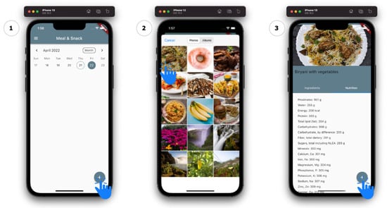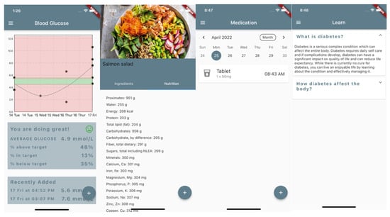 The diabetes self-management platform mobile app is the front end with which the patients will interact. The diabetes self-management mobile app is built using the Flutter SDK [], which makes it a cross-platform app that can be used in both iOS and Android devices. The patient is required to log in to their personalized user account, which is created by an assigned clinician. The login process is authenticated by the API. The diabetes self-management mobile app contains various features that allow the patient to interact with the app and track their progress in regard to their blood sugar readings, any medication they have been taking, meals they have been consuming, or even any fitness activities in which they have taken part. In Figure 2, some of the described features from the diabetes self-management mobile app are displayed. In addition to the above, the diabetes self-management mobile app implements a macronutrient detection algorithm that leverages the use of AI-driven image analytics and other services not only to help the patient better understand the meals they are eating but also to improve the meal logging process by making it simpler.