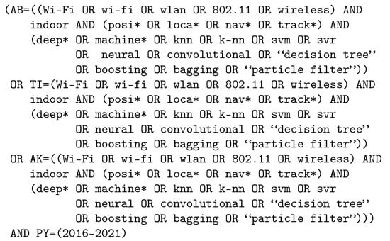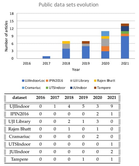 Thus, this work has two main contributions: (1) a review of papers published between 2016 and 2021 that use machine learning for indoor positioning, reporting information about the algorithms used, type of article (experimental/simulated), number of Access Point (AP) used, number of radio map reference points used, results obtained, type of signal used, and use or non-use of rooms in experiments; and (2) an analysis of how the main dataset, UJIindoorLoc, has been used in those papers along with the main drawbacks detected when using datasets. The selection of papers in this review was performed following the PRISMA guidelines [].