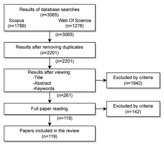 As can be seen, the original number of papers, after removing duplicates, was 2201. After reviewing them, 119 satisfied the inclusion criteria, and thus are the papers analyzed in the current work.