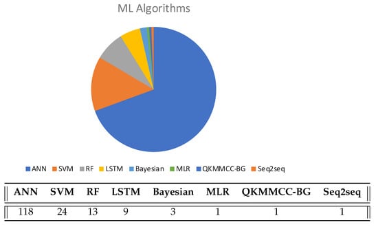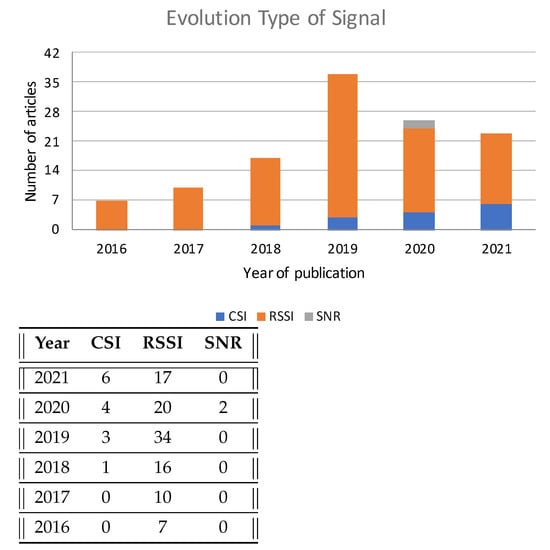Figure 4 shows the distribution of algorithms. From these results it can be seen that the most commonly used algorithms are those based on ANN. Specifically, there are up to 118 works (around  of the total analyzed works) that use this machine learning model or any of its variants (Deep reinforcement learning (DRL), Extreme learning machine (ELM), Convolutional Neural Networks (CNN), Deep Neural Networks (DNN), Back-Propagation Neural Network (BPNN), Capsule Neural Network (CapsNet), Stacked Denoising Autoencoders (SDA), Variational Autoencoder (VAE), Deep Belief Network (DBN), Recurrent Neural Networks (RNN), Multilayer Perceptron (MLP), Neural Network (NN), Single Multiplicative Neuron (SMN), and Deep Q-Networks (DQN)). Neuronal network-based algorithms are specially appropriate for nonlinear functions, and the fluctuating signal type of Wi-Fi fits perfectly into them.