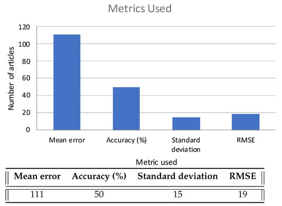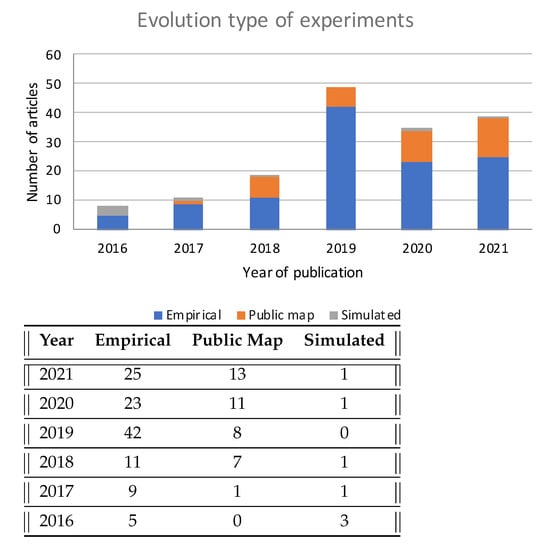 The number of solutions based on ANN has been growing in recent years. In fact, by the year 2021, 20 out of 24 articles used ANN. In addition, the best result in the analyzed papers (mean error of  ) were obtained using a Deep Neural Network to process data from Wi-Fi mmWave signals []. However, as we will see later, these results alone do not indicate anything, as factors such as the size of the test area, number of APs, etc. affect these results.