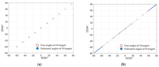 In this part, we assumed that the number of snapshots was 200 and the signal-to-noise ratio (SNR) was 10 dB. There were 10 fully coherent targets in the airspace, and their positions were distributed over the range [−60°, 75°], where the DODs and DOAs were all located at [−60°, −45°, −30°, −15°, 0°, 15°, 30°, 45°, 60°, 75°].