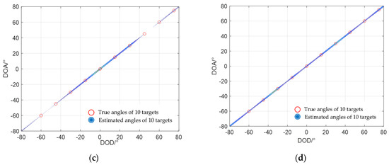 Figure 3 shows the spatial spectrum contour of the DOD and DOA joint estimation for coherent targets. The red circles denote the true angles of 10 targets, and the spectral peak contour denotes the estimated angles of 10 targets. The four figures in Figure 3 are as follows: (a) LMR algorithm; (b) SMS algorithm; (c) ASDS algorithm; and (d) TRDS algorithm. Figure 3a shows the spectral peak contour completely overlapped by the red circles, so we could clearly estimate 10 targets using the LMR algorithm. However, the spatial peaks overlap each other in the other figures, and it was difficult to estimate all target numbers using another algorithm. So, the simulation results in this part proved the effectiveness of the LMR algorithm in the performance of the degrees of freedom.