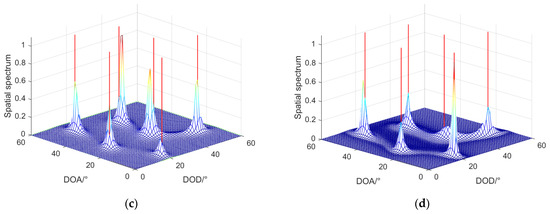 Figure 4 shows the spatial spectrum of the DOD and DOA joint estimation for the coherent targets. The red lines denote the true angles of six targets, and the spectral peak denotes the estimated angles of six targets. The four figures in Figure 4 are as follows: (a) LMR algorithm; (b) SMS algorithm; (c) ASDS algorithm; and (d) TRDS algorithm. Figure 4a shows that the spatial spectral peaks completely overlapped with the red line, so we could use the LMR algorithm to obtain a clear spatial spectral peak map. However, the spatial spectral peaks of other figures had difficulty corresponding to the red line, and some spatial spectral peaks even overlap each other in Figure 4b. Thus, the simulation results in this part proved the effectiveness of the LMR algorithm in the performance of the spatial spectral estimation.