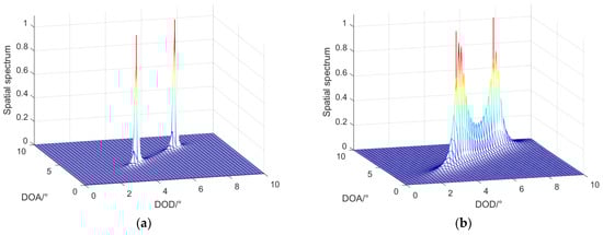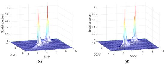 In terms of the spatial spectrum estimation algorithm, we chose the RD-MUSIC algorithm [32]. The RD-MUSIC algorithm not only avoids the high complexity of the 2D-MUSIC algorithm, but also has a better performance compared with the ESPRIT algorithm [33]. Moreover, the RD-MUSIC algorithm can automatically match the DOD and DOA without additional angle pairing.