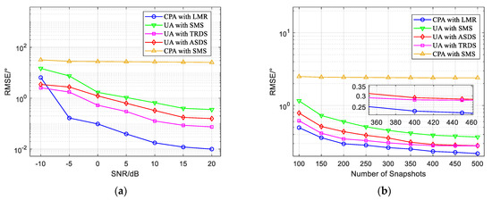 Figure 6a depicts the variation in the RMSE curve with the SNR, where the number of snapshots was set as 200. The LMR algorithm based on a coprime array had a higher estimation accuracy than the other algorithms under the condition of a high SNR, but its estimation performance was not satisfactory in low SNR conditions. Figure 6b depicts the variation in the RMSE curve with the number of snapshots, where the SNR was set as 10. The LMR algorithm had a high estimation accuracy with a different number of snapshots. In order to demonstrate the advantage of the proposed method for estimating coherent targets, we compared it to the SMS algorithm based on a coprime array, as shown in Figure 6. We found that using the SMS algorithm based on a coprime array resulted in a poor estimation performance, which proved it could not estimate coherent signals.