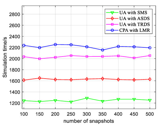 According to the previous simulation, the LMR algorithm proposed in this paper was better than other algorithms in terms of the number of estimated targets, angular resolution, and estimation accuracy. Due to the addition of a convex optimization algorithm, the complexity of the LMR algorithm was higher than that of the other algorithms. In terms of time complexity, when 200 Monte Carlo simulation experiments were performed, Figure 7 represents a comparison of the time complexity of different algorithms with the different number of snapshots. As presented in Figure 7, the simulation showed that the LMR algorithm could achieve the effect of enhancing the performance of angle estimation by adding a small amount of computation.