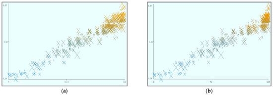 Figure 13a–e shows the result of the SOM, which represents the classification of cloud services based on the identified criteria while operating in a cloud environment, assuming that one parameter remains constant. The small clusters, represented with different colors, show different categorizations of services with specific clusters. The K-means method was used to partition the clusters, resulting in the formation of five clusters, as shown in Table 7. Cluster membership is shown by different colors. A great degree of the availability, security, and reliability states with low costs indicates high-ranked cloud services. In contrast, a low degree of the availability, security, and reliability states with high costs indicates low-ranked cloud services. However, a moderate degree of the availability, security, and reliability states with moderate costs indicates moderate-ranked cloud services. The maps depict different categorizations of cloud services based on fluctuations in the identified parameters. Clusters’ density characterizations are shown in Table 8.