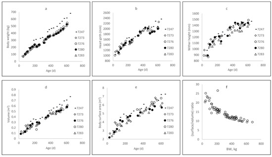 Dynamics of body weight (a), heart girth (b), wither height (c), surface area (d), and volume (e) as a function of age, and (f) surface-to-volume ratio as a function of body weight for five Holstein heifers, from 5 weeks of age until the end of gestation.