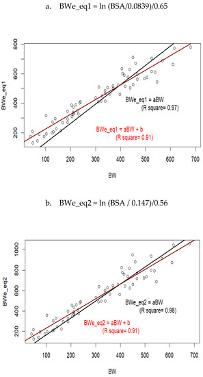When regression models were forced to pass through 0, Equations (1)–(3) and (5) overestimated BW, and even the most accurate equation, Equation (4), slightly underestimated it.