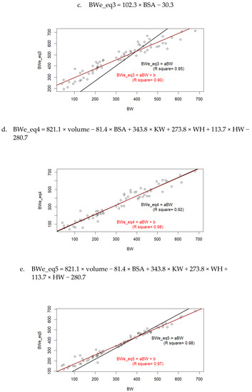 Measured values of body weight (BW) compared to values estimated (BWe) as a function of body surface area (BSA), volume, withers height (WH), and/or buttock width (WH), using equations from Elting [10] (a,b); or Le Cozler et al. [13], (c–e).