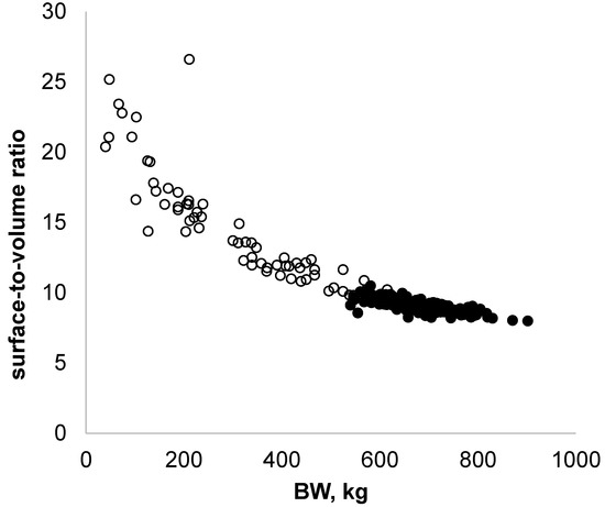 Changes in surface-to-volume ratio as a function of body weight for five Holstein heifers, from 5 weeks of age until the end of gestation (empty circles; n = 68 observations), supplemented with data from adult cows (full circles; n = 177 observations).