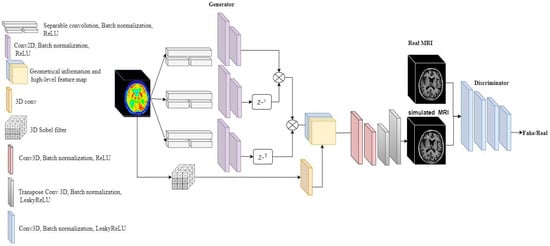 By performing Sobel filter the extracted edges are scale dependent. To fix this issue, we applied a 3D convolution after Sobel operator to have the same scale as the feature map and smooth the thickness of some edges. The last part of the generator decodes the T1-weighted MRI from high-level features and the geometrical information retrieved from the FDG-PET images. The decoder consists of four layers of 3D convolutions following a Batch normalization and a LeakyReLU as the activation function (Figure 1).