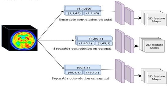 As represented in Figure 2, we used two blocks of separable convolutions in sagittal, coronal, and axial views to map the spatial information in each axes of the PET image into 2D. Each block includes three separable convolutions. The first separable convolution is of size (90, 1, 1) for axial, (1, 90, 1) for sagittal, and (1, 1, 90) for coronal view. These blocks capture long-range dependencies in each axis. The second part of Elicit network has two separable convolutions of size (45, 1, 1), (1, 45, 1), and (1, 1, 45) for axial, sagittal and coronal views respectively. These blocks with a smaller kernel size capture local dependencies and information in the PET images. After the separable convolutions we have 2D spatial information extracted from 3D images. The second part of the Elicit network includes two 2D convolutions to extract the related features in each axis. Figure 2, represents the Elicit network in detail.