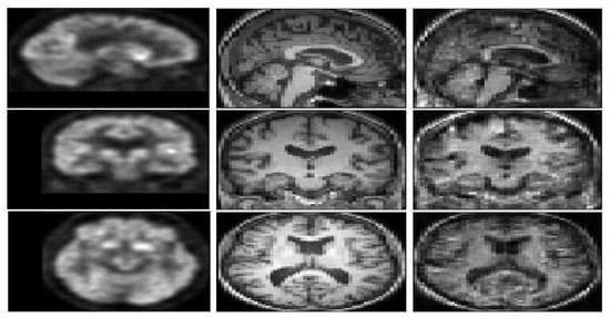 A pair of FDG-PET (left image), the ground truth T1 weighted MRI (middle image), and the generated image (right image) with E-GAN.