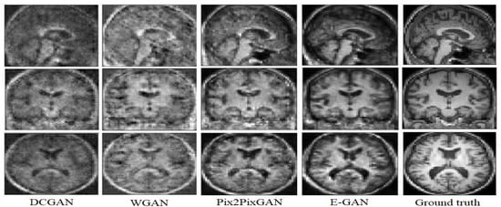 The DCGAN almost could not generate the uniform tissues and the generated image only has the main structure of the T1 weighted MRI. While the synthetic result of the WGAN has a better performance on synthesizing the structure of T1 weighted MRI, the synthetic images often preserve noise. The Pix2Pix GAN architecture obtains more details inside the tissues but both the Pix2Pix GAN and the WGAN performed poorly for the boundaries and sometimes visual artifacts in the corner of the synthetic images. E-GAN shows a good performance in terms of generating boundaries and edges.