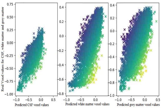 As expected the difference in the voxel values between the generated images and real images is quite low. It means that the generated images regarding the voxels values are highly correlated to the ground truth. In the next section, we assess the model in terms of tissue analysis.