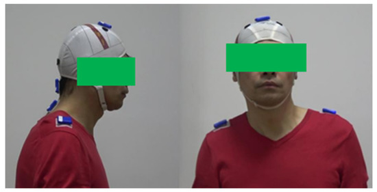 The Inertial Measurement Unit (IMU) based method uses a multi-axis sensor combination device [14] to assess abnormal patterns of CD. Doctors attach IMUs to the patient’s neck and head to measure the motion angles. Compared with the manual assessment method, this method is more convenient. However, physical contact will make the patient uncomfortable. The patient needs to wear a head positioning cap [15] to ensure that the sensors are correctly positioned, as shown in Figure 2. The head positioning cap is tightly tied to the head, which will make the patient feel uncomfortable or even painful, especially for obese people. The drifting problem is that the inherent imperfections and noise within the IMU will cause errors. These errors will accumulate as angle estimates drift over time. It will result in a difference between the estimated and actual angles, which will cause errors in the measurement.