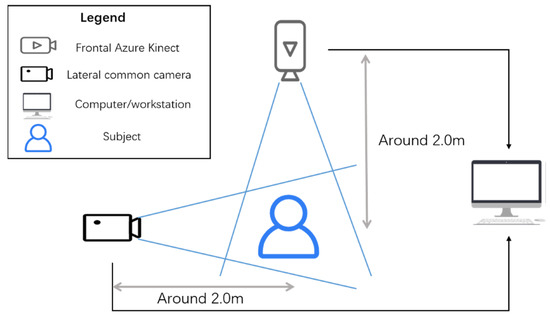 The multi-view vision based scoring method uses the Azure Kinect to capture the frontal color and Infrared Radiation (IR) images and the HP 320 FHD Webcam to get the lateral color image, as shown in Figure 3. The Azure Kinect is a new RGB-D sensor released by Microsoft. It consists of an RGB camera and an IR camera. The resolution of the color camera is 1920 × 1080 px at 30 fps. The resolution of the IR camera is 512 × 512 px at 30 fps. Its weight is 440 g, and its size is 103 mm × 39 mm × 126 mm [28]. The HP 320 FHD Webcam is a USB camera released by Hewlett-Packard. It has a resolution of 1980 × 1080 px at 30 fps. Its weight is 130 g, and its size is 72 mm × 54 mm × 23 mm [29]. The frontal Azure Kinect was placed at a distance of around 2.0 m in front of the subject, while the HP 320 FHD Webcam was placed at a distance of about 2.0 m on the side of the subject. The Azure Kinect Body tracking SDK captures the 3D keypoint positions of the subject, and the later 2D keypoint positions of the subject are captured by the You Only Look Once (YOLO) model [31,32] and HRNet [18] model. The frontal 3D keypoint positions are used to automatically calculate the yaw axis angles (rotation) and roll axis angles (lateral tilting). The 2D lateral position is used to automatically calculate the pitch axis angles (sagittal flexion and extension).