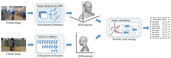 In recent years, vision based human pose estimation (HPE) has made significant progress and has begun to be widely used in related fields. Two-dimension (2D) HPE methods such as Convolutional Posture Machine (CPM) [16], Hourglass [17], and High-Resolution Net (HRNet) [18] estimate the 2D position of human body keypoints from images or videos. Three-dimension (3D) HPE methods such as SimpleBaseline3D [19] and VideoPose3D [20] estimate the 3D position of human body keypoints. It is possible to use computer vision technology in medical diagnosis. Li et al. used the CPM to extract the joint motion trajectory from the video and then calculated the relevant characteristic parameters. The patient’s pathological motion was measured using the random forest to predict their clinical class [21]. Guo et al. extracted keypoints from the patient’s video to assess the abnormal level of Parkinson’s disease [22]. Viswakumar et al. proposed a cost-effective method for human gait analysis that uses a mobile phone camera [23]. Nakamura et al. developed a system analyzing the three-dimensional keypoint positions obtained by Kinect v2 [24] to measure head and neck movement angles. It can calculate the TWSTRS severity scale score semi-automatically [25]. Their results showed a good correlation between the system and a neurologist in torticollis and laterocollis, but poor agreement in antecollis/retrocollis. Since pitch errors were always higher than yaw and roll errors when using monocular Kinect v2. These cases fully demonstrate the feasibility of vision-based methods in scoring on the severity scale.