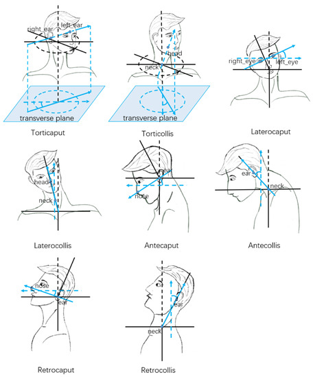 In clinical practice, the target muscle of botulinum toxin therapy is usually selected by the abnormal movement pattern of the patient. According to the clinical manifestations, the abnormal movement patterns of patients can be classified as torticollis (rotation in the transverse plane), laterocollis (lateroflexion in the coronal plane), retrocollis (anteflexion in the sagittal plane), anterocollis (retroextension in the sagittal plane), or a combination of the above [8]. With the widespread use of botulinum toxin therapy, researchers found that the past four abnormal movement patterns had described cervical dystonia too simply to account for the various clinical symptoms, making it difficult to select the responsible muscle for treatment. According to the collum-caput concept, each pattern can be divided into two subtypes. One is abnormal movement relative to the neck from the head, and the other is abnormal movement relative to the neck from the torso. Each abnormal movement pattern corresponds to a part of the muscles [9,10,11,12]. As shown in Figure 1, torticollis can be subdivided into torticollis and torticaput. Laterocollis can be subdivided into laterocollis and laterocaput. Antecollis can be subdivided into antecollis and antecaput. Retrocollis can be subdivided into retrocollis and retrocaput.