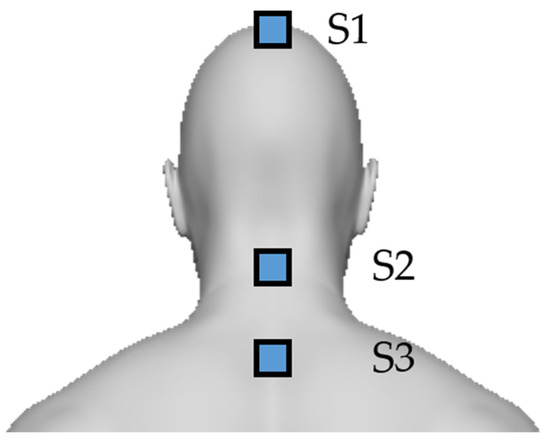 The IMU based method captures the neck and head motion angle from 3 LPMS-B2 attached to the subject body. The LPMS-B2 is a wearable inertial sensor released by Alubi. It can capture 6 degrees of freedom data from a triaxial accelerometer and a gyroscope at 400 Hz. Its weight is 12 g, and its size is 39 mm × 39 mm × 8 mm [30]. As shown in Figure 7, the S1 sensor is attached to the top of the head, the S2 sensor is attached to the C3-C4 of the cervical spine, and the S3 sensor is attached to the C7 of the cervical spine. These sensors can measure the angle of pitch, roll, and yaw using three rate gyros. For torticaput, the angle of yaw between S1 and S2 is calculated. For torticollis, the angle of yaw between S2 and S3 is calculated. For latercaput, the angle of roll between S1 and S2 is calculated. For laterocollis, the angle of roll between S2 and S3 is calculated. For antecaput/retrocaput, the angle of pitch between S1 and S2 is calculated. For antecollis/retrocollis, the angle of pitch between S2 and S3 is calculated.