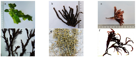Dominant species in the intertidal zone of Gouqi Island: (a) Ulva pertusa; (b) Sargassum thunbergii; (c) Chondrus ocellatus; (d) Chondria crassiaulis; (e) Sargassum fusifarme; (f) Grateloupia filicina.