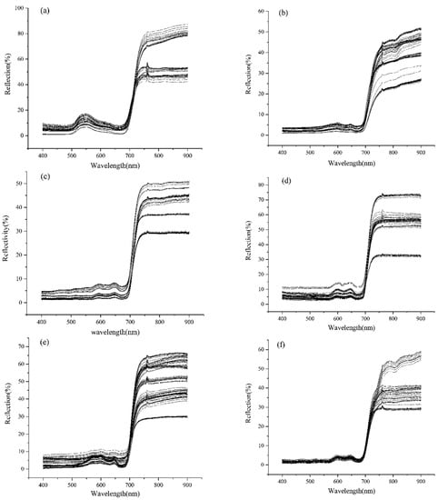 Spectral curves of six species of seaweed: (a) Ulva pertusa; (b) Sargassum thunbergii; (c) Chondrus ocellatus; (d) Chondria crassiaulis; (e) Sargassum fusifarme; (f) Grateloupia filicina; In (a–f), different lines represent different seaweed samples.
