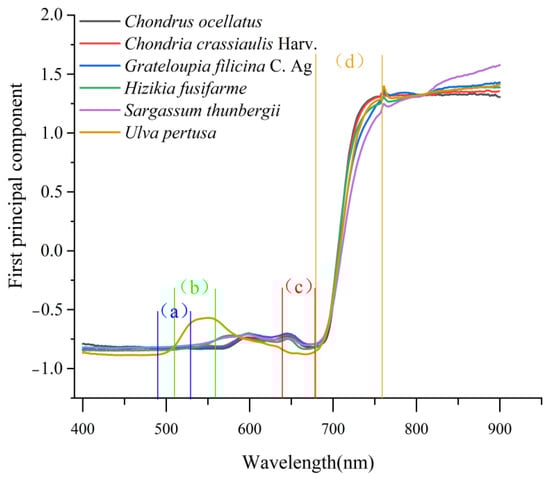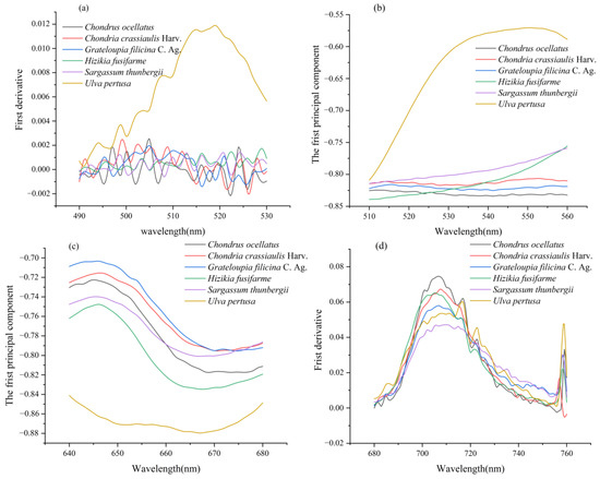Each seaweed was subjected to PCA, and their loadings were all greater than 90%, indicating that the first principal component can effectively express the information in each seaweed dataset. The positions of the green peak, red valley, blue edge, and red edge are marked on the spectral curves, as shown in Figure 4. To observe the trends in the spectral variables more clearly, the four regions corresponding to the reflection spectra and the first-order derivative spectra in regions (a), (b), (c), and (d) are enlarged in Figure 5 to obtain four spectral enlargements.