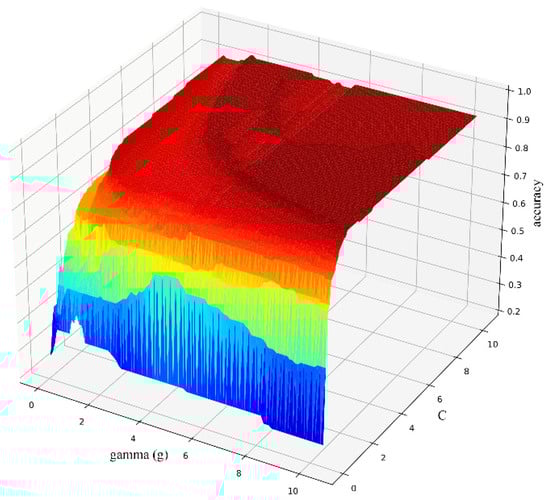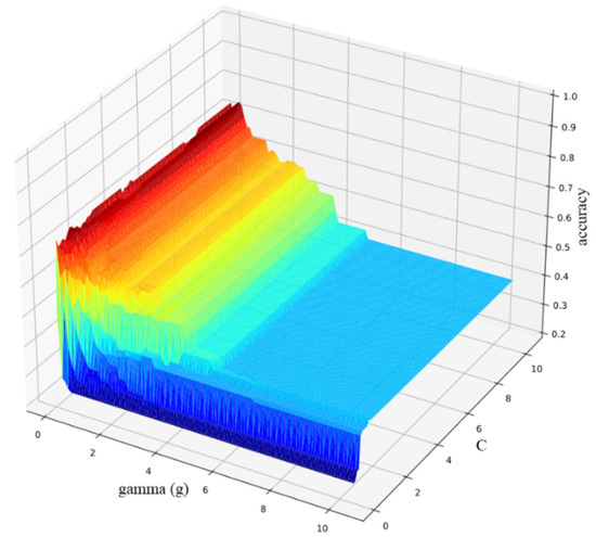 As can be seen from Table 3, when all 14 variables were used to distinguish between the seaweed species, the effect was the worst, only 40.89%; when the variables with smaller significance (larger P) were eliminated one by one, the discrimination accuracy increased. Until the four variables with the lowest significance were eliminated, the highest discrimination accuracy was 74.99%. Then, as the number of input variables decreased, the discrimination accuracy also decreased. In order to explore the best model parameters, the parameters of each model were optimized. Using the grid-search method (CV = 4), the optimal input parameters of the SVM model were determined, and the relationship between the parameters and accuracy was obtained (interspecific, Figure 6).