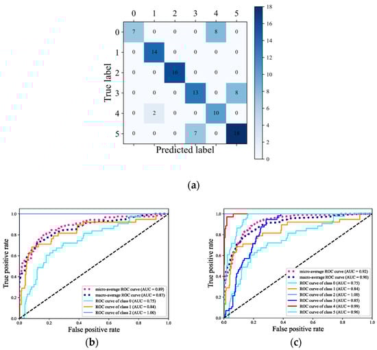 Confusion matrix and ROC curves of the optimal SVM model for the classification of six species of seaweed in the intertidal zone. 0–5 in (a) and classes 0–5 in (c) are Chondria crassiaulis, Chondrus ocellatus, Ulva pertusa, Sargassum thunbergii, Grateloupia filicina, and Sargassum fusifarme, respectively; classes 0–5 in (b) are Rhodophyta, Phaeophyta, and Chlorophyta.