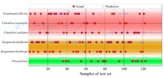 In this paper, spectral variables with lower P values were eliminated one by one, and the classification accuracy was gradually improved. When the NDVI (Rg, Rr), RVI (Rg, Rr), Vre, Abe, Rg, Lre, Lg, and Lr were used as input variables, the accuracy of the model was the highest. A support vector machine with a soft margin algorithm was used to classify the seaweed spectra. At the same time, XGBoost was mixed with SVM in vote mode to classify the same datasets. The input variables of this spectral curve were obtained by the same processing method as the ones used for the other seaweed varieties. The distribution range of these two seaweed varieties is small. Due to their small volume, they are neither common nor dominant species, so it is difficult to collect and analyze them, and they were not collected in the experimental stage. In order to fill the gap found in green seaweed, we obtained the spectral curves of Ulva prolifra by searching the literature [22]. Additionally, as it belongs to Category 7, it was substituted into the classification model for operation. Because there was only one sample, the training set could not be set, but misclassifications were only observed in Ulva pertusa (Chlorophyta), and not in Rhodophyta or Phaeophyta. As shown in Figure 9, the fault diversity of red seaweed falls in Rhodophyta, and the fault diversity of brown seaweed falls in Phaeophyta. The results are basically consistent: the classification effect of seaweeds from the same phylum was better (93%), and the classification effect of seaweeds from different species was worse (74%).