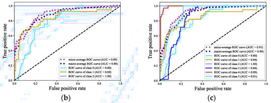 The evaluation indicators calculated by the macro-average method considered all of the classes to be of equal importance. Under each category, the probability of the m test samples can be obtained for each category. Therefore, according to each corresponding column in the probability matrix and the label matrix, the false positive rate (FPR) and the true positive rate (TPR) under each threshold can be calculated to create an ROC curve. In this way, the total of n the ROC curves can be drawn. Finally, the final ROC curve can be obtained by averaging the n ROC curves (macro-averaged ROC). From Figure 8b,c, the area under the curve (AUC) corresponding to the macro-averaged ROC curve of the phyla and seaweed species is 0.87 and 0.90, respectively. The micro-average-calculated evaluation indicators consider the contribution of each sample. The AUC corresponding to micro-averaged ROC curve of the phyla and seaweed species is 0.89 and 0.92, respectively. The AUC value corresponding to each ROC curve is greater than 0.75. The AUC of Ulva pertusa and Chlorophyta is 1.00, as shown in Figure 8a (the predicted label of Category 2 in the confusion matrix is all equal to the actual label). Rhodophyta has the lowest AUC. Chondria crassiaulis, Chondrus ocellatus, and Grateloupia filicina belong to classes 0, 1, and 4, and have AUC values of 0.75, 0.84, and 0.99, respectively.