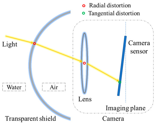 When an underwater robot uses a camera to collect images, it is affected by the robot’s own structure, camera, and environment, making the imaging distorted, and this distortion can cause errors in the SLAM accuracy [19]. The distortion comes mainly from two aspects, as shown in Figure 2. On the one hand, light propagates from one medium to another, and the phenomenon of refraction occurs. In underwater SLAM, light passes through the transparent shield of the underwater robot, the air, and the camera lens, and is finally imaged on the camera imaging plane. Propagation in different media causes a change in the direction of the light, resulting in radial distortion. On the other hand, the lens of the camera sensor itself is not mounted parallel to the light-sensitive plane, causing tangential distortion when the light passes through the lens to reach the imaging plane.